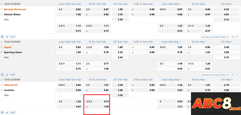Khi truy cập thành công vào sảnh thể thao abc8. Các bạn hãy tìm thông tin về các trận đấu sắp diễn ra. Ở ngay phần giao diện chính của bảng tỷ lệ kèo nhà cái. Chúng ta sẽ tìm ở cột kèo O/U hiệp 1 và cả trận. Nếu thấy kèo cược nào có tỷ lệ 2.25 trái hoặc 2-2.5 thì đây chính là kèo mà chúng ta muốn chơi.